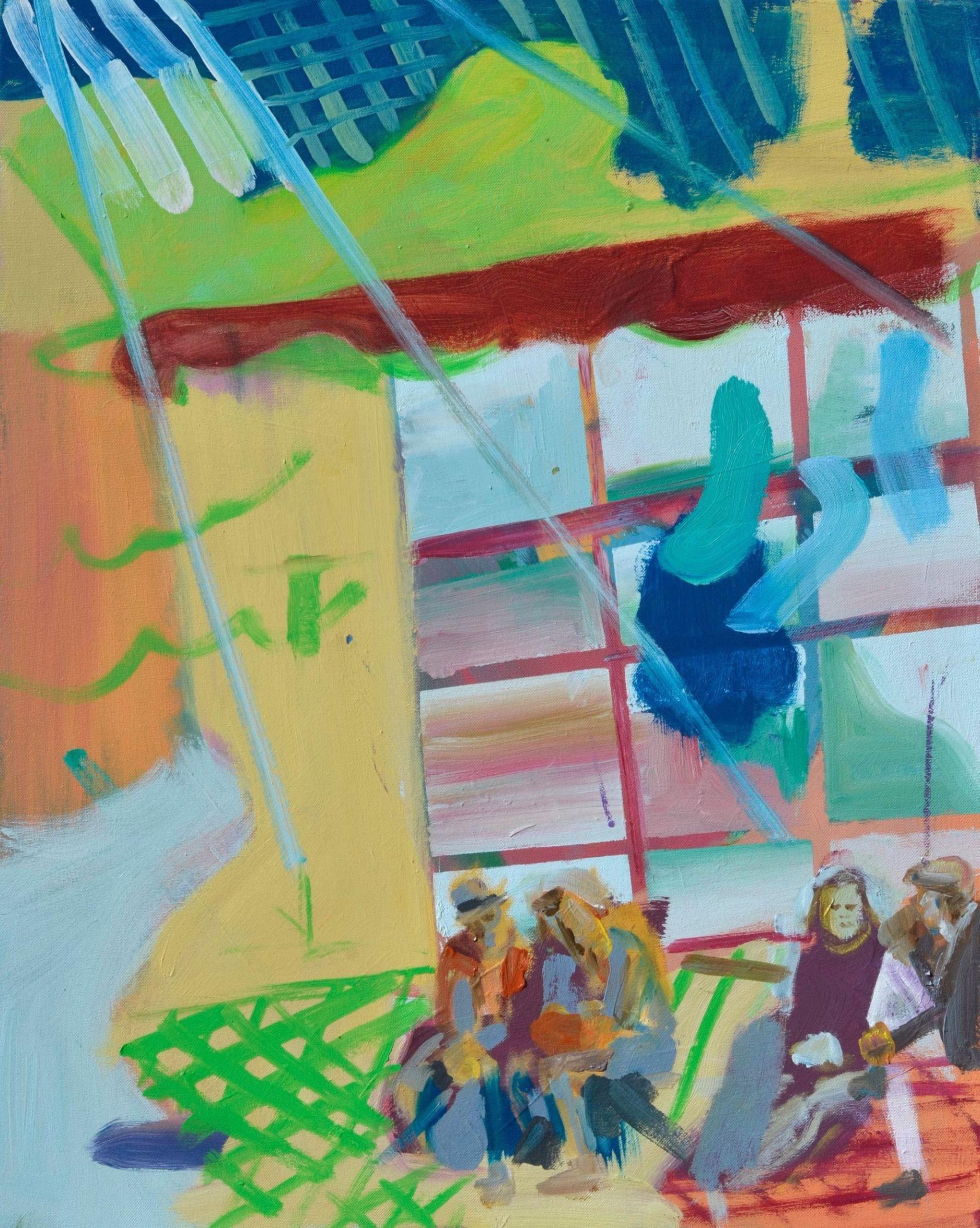 A light-hearted yet deep oil on canvas piece titled ‘Chat under the sunlight’, focusing on human connection. Created in 2021.