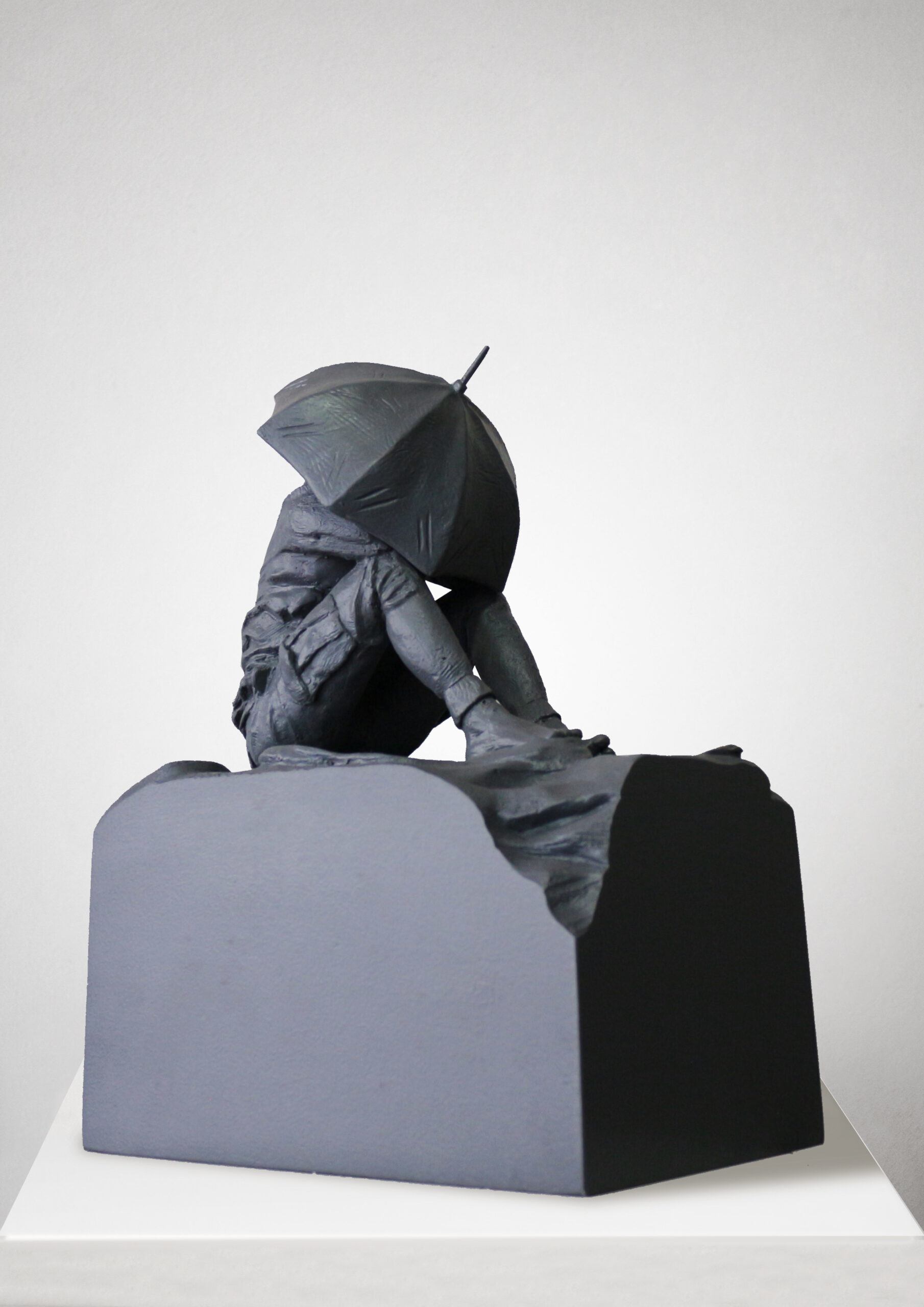 Born in İzmir in 1994, Emre Evcimen graduated from the Sculpture Department of Dokuz Eylul University Faculty of Fine Arts in 2020. Despite his young age, his sculptures are already part of important collections in Turkey. In his works, he depicts a figure with an umbrella in various situations, exploring the mismatch between external realities and our expectations. Rather than focusing on the space beneath the umbrella, he is more concerned with the area outside of it.