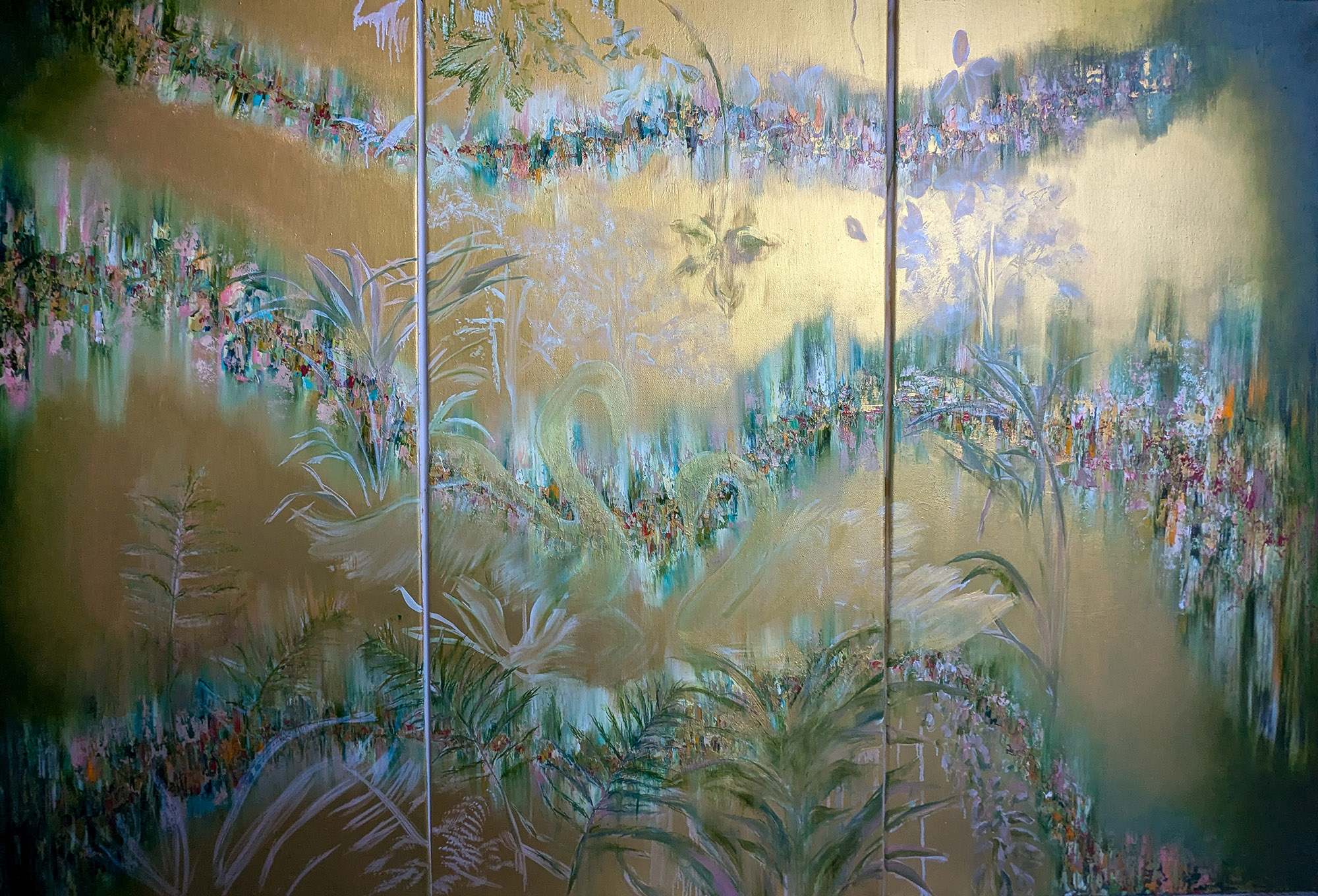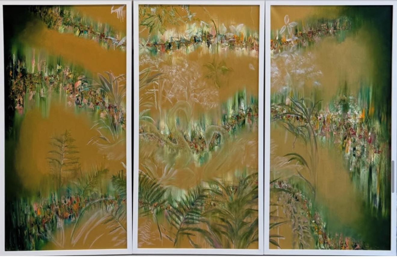 This triptych consists of three framed canvases, each measuring 100 cm × 50 cm and total of 103 × 159 cm (Framed). The work combines acrylic and oil paints, creating layered textures and depth across the three panels.