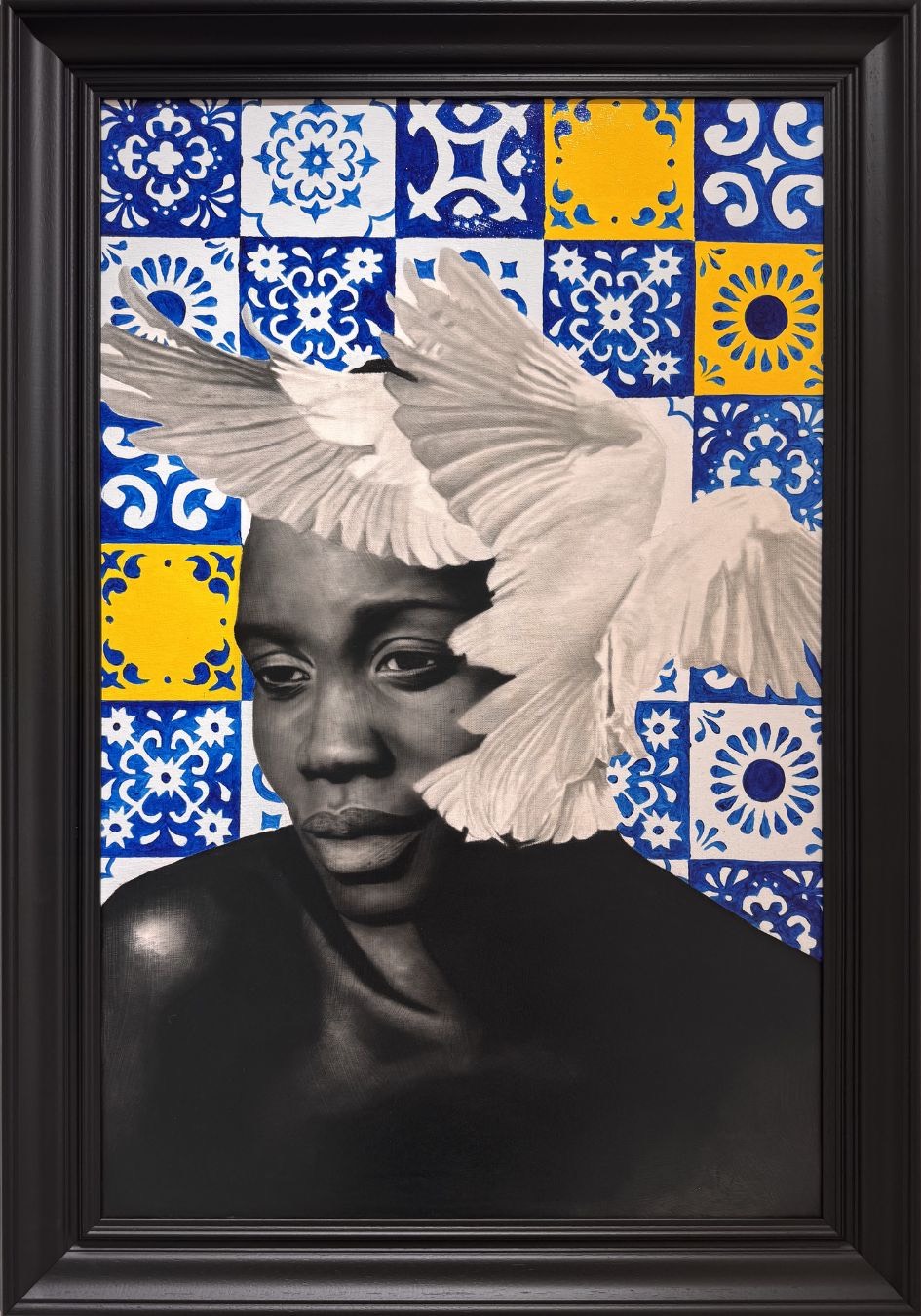 Intimidade II (2024) is one of the most striking works by Ritchelly Oliveira, a Brazilian artist currently living in Portugal. This piece marks the first time he incorporates Portuguese inspiration into his artistic practice. Using charcoal and acrylic on canvas, Ritchelly creates a powerful dialogue between cultures, emotions, and symbolic storytelling. The background, composed of Portuguese tile motifs in blue, white, and yellow, introduces a strong cultural element that reflects the country that now shapes his life and work. In the foreground, the artist presents a deeply intimate and expressive portrait, a hallmark of his visual language. The figure is surrounded by white birds, a recurring symbol in Ritchelly’s oeuvre. In his work, birds represent fragility, emotional sensitivity, and inner states, acting here as a metaphor for the delicate construction of identity and memory.