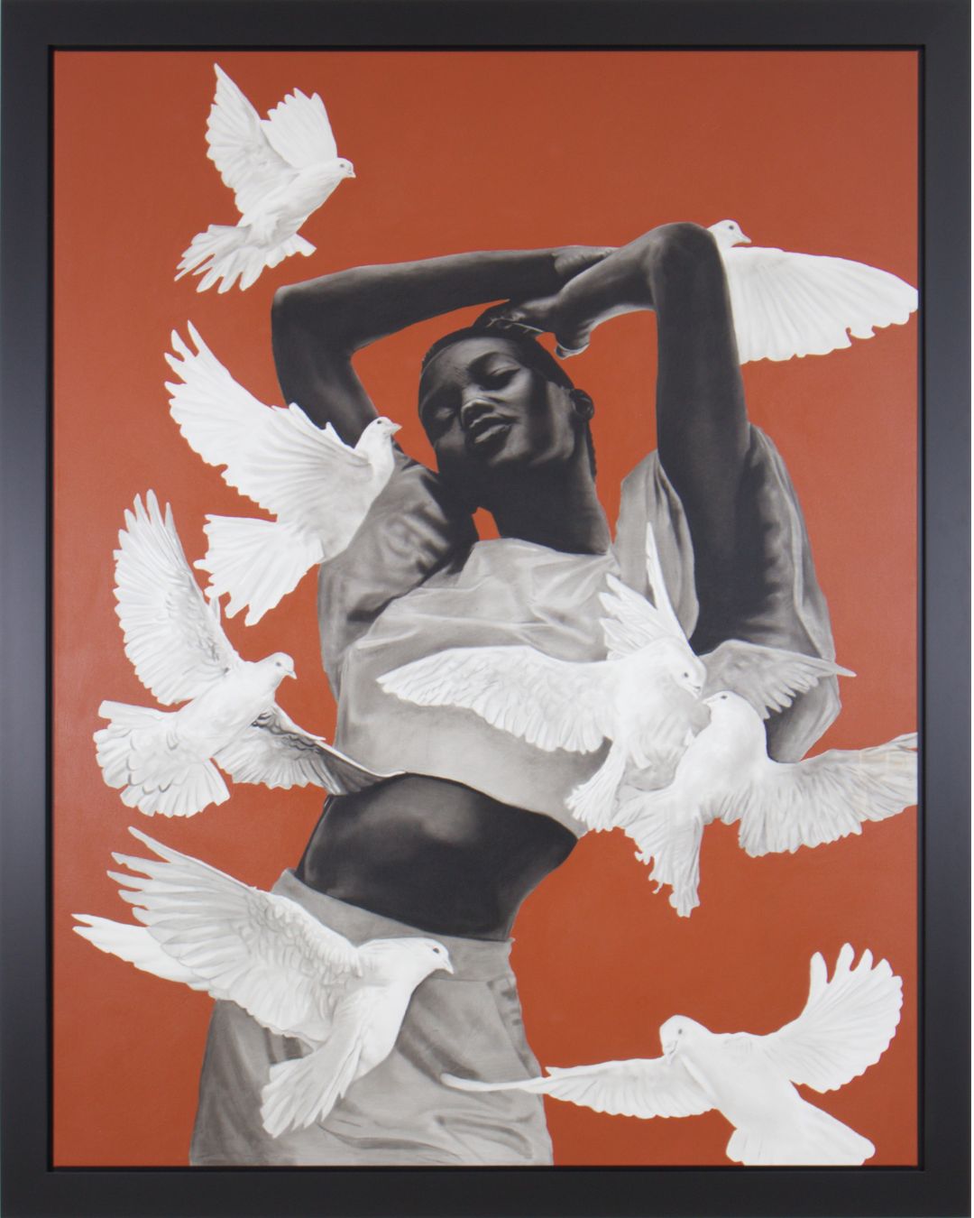 “Recomeço” (2024) is a charcoal and acrylic on canvas painting by Ritchelly Oliveira. The birds symbolize moments of fragility, capturing the delicate balance between vulnerability and the liberating promise of renewal. Framed against a warm terracotta backdrop, the brilliant white of the doves contrasts sharply with the deep, velvety shading of the central figure, an interplay that heightens the sense of transformation at the heart of the piece. Technically, Oliveira’s skilled use of charcoal creates a rich textural depth in the figure, while acrylic brings a crisp luminosity to the doves, underscoring their role as both fragile and hopeful emblems of a fresh start. “Recomeço” thus distills the artist’s enduring fascination with the power of introspection, revealing how embracing one’s vulnerabilities can pave the way for personal rebirth.