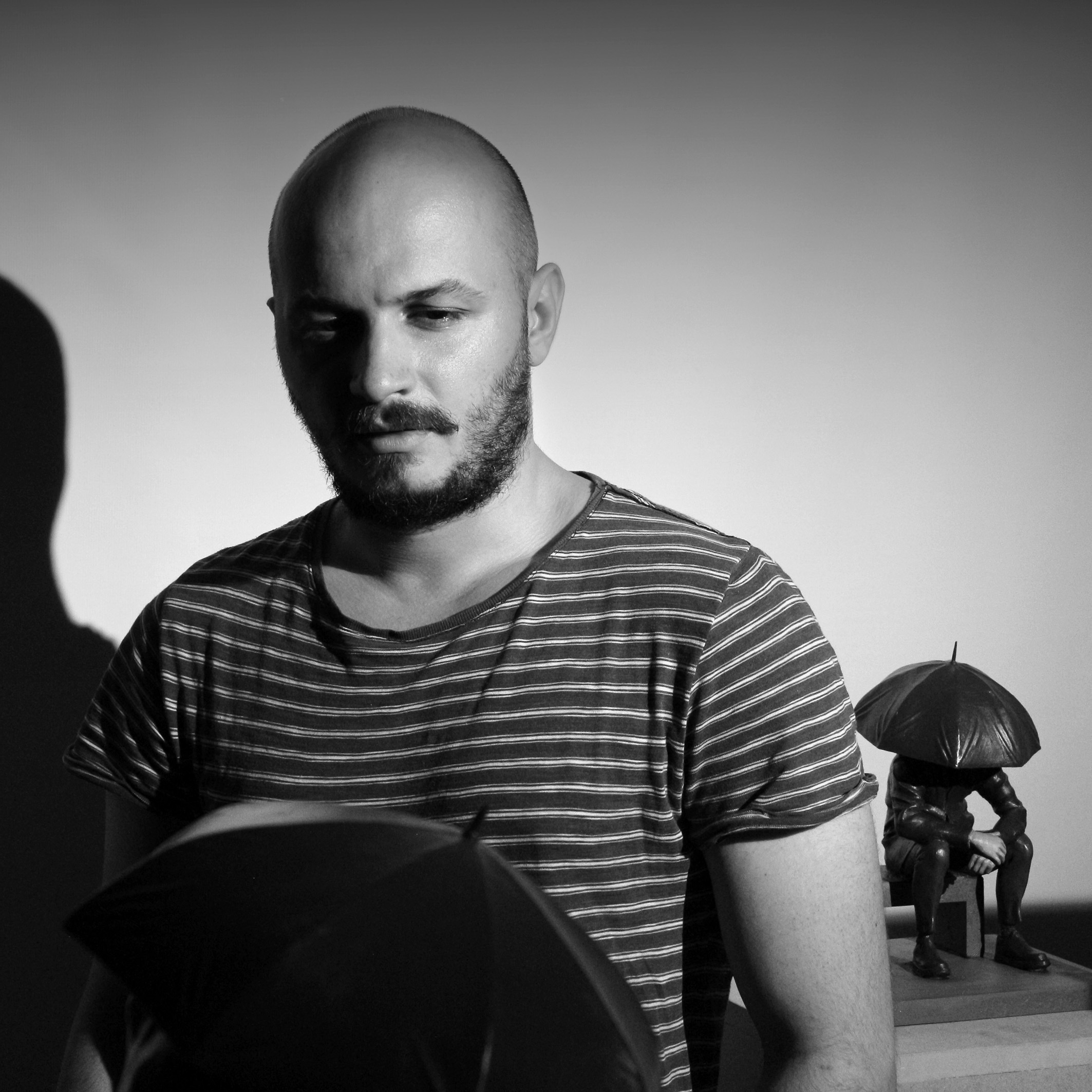 Born in İzmir in 1994, Emre Evcimen graduated from the Sculpture Department of Dokuz Eylul University Faculty of Fine Arts in 2020. Despite his young age, his sculptures are already part of important collections in Turkey. In his works, he depicts a figure with an umbrella in various situations, exploring the mismatch between external realities and our expectations. Rather than focusing on the space beneath the umbrella, he is more concerned with the area outside of it.